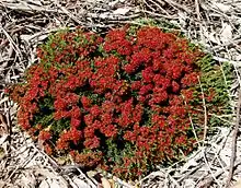 The flowers are mouse-scented, arranged corymb-like groups with each flower on a stalk 1–2 mm (0.04–0.08 in) long. They are lemon-yellow and red, golden-yellow and orange to bronze, or deep red. The floral cup is broadly top-shaped, about 0.8 mm (0.03 in) long, hairy and more or less smooth. The sepals are yellow to dark red, about 1.7 mm (0.07 in) long, with 4 lobes which have long-hairy ends. The petals are about 1 mm (0.04 in) long, broad egg-shaped with a finely toothed margin, shiny yellow to dark red. The style is 4.0–5.5 mm (0.16–0.22 in) long, straight or gently curved with a few short hairs. Flowering time is from January to July.[3]