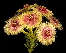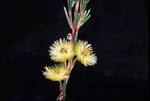 The flowers are scented and arranged in rounded, corymb-like groups near the ends of the branches, each flower on a stalk 10–25 mm (0.4–1 in) long. The floral cup is about 2.5–3.5 mm (0.098–0.14 in) long, glabrous and slightly warty in the lower half. The sepals are lemon-yellow, bright yellow or golden-yellow but quickly age to pinkish-red, reddish-brown or reddish-grey, spreading, 5–6.5 mm (0.20–0.26 in) long, with 10 to 13 densely hairy lobes. The petals are the same colour as the sepals, spreading 4.5–6 mm (0.18–0.24 in), with long, pointed finger-like projections. The tips of the stamens have two horn-like appendages. The style is straight, about 1 mm (0.04 in) long, and glabrous. Flowering time is from August to December.[2]