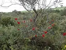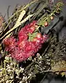 The large and bright red flowers of Verticordia grandis have been admired and harvested since its first discovery by Europeans, when Drummond noted its use as an adornment by the people of the region. He described in his first report as the "most beautiful of Australian plants".[2] The cut flower has a vase life of less than 10 days, shorter that other harvested verticordia, and is unresponsive to treatments that extend this period. A technique for extending this is required for viability as an exported commodity.[12] The dried specimens of freshly opened flowers are less brittle and long lasting in ornamental displays.[1] Until a prohibition on unlicensed collection, the species was harvested by sometimes careless pickers; the floral industry is now supplied by professional pickers or growers. The development of micropropagation for the plant is expected after its successful genetic transformation in 1993, this was achieved using meristematic cells that were found to be present in the leaves.