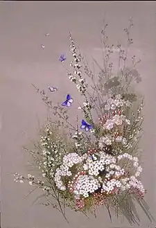 The flowers are arranged in rounded or corymb-like groups near the ends of the long flowering stems, each flower on an erect stalk, 6–13 mm (0.2–0.5 in) long. The floral cup is about 1.5 mm (0.06 in) long and covered with short, soft hairs. The sepals are white, sometimes pale pink, spreading but curving upwards, 3–4 mm (0.1–0.2 in) long, with 8 to 12 hairy lobes and two ear-shaped, hairy appendages on the sides. The petals are the same colour as the sepals, egg-shaped to almost round, 2.5–5 mm (0.1–0.2 in), spreading with a smooth edge and are joined with the ring of stamens and staminodes, to form a short tube. The style is less than 0.5 mm (0.02 in) long, straight and glabrous. Flowering time is from September to December.[3]