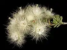 The flowers are unscented and arranged in rounded groups near the ends of the branches, each flower on a stalk 4–11 mm (0.2–0.4 in) long. The floral cup is top-shaped, about 2 mm (0.08 in) long, smooth and partly hairy. The sepals are creamy-lemon coloured when they open, ageing to pink then red, 7–8 mm (0.28–0.31 in) long and lack lobes but are deeply divided with spreading hairs. The petals are a similar colour to the sepals, more or less round and spreading, about 2 mm (0.08 in) long and wide with a fringe of hairs around their edge. The staminodes are lance-shaped to egg-shaped, tapering towards the tip which is fringed with hairs. The style is straight, 5–5.5 mm (0.20–0.22 in) long, has spreading hairs around its upper part and has a cap-like stigma. Flowering time is mostly from September to November.[2]