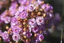 The scented flowers are arranged in round or corymb-like groups, each flower on a stalk 7–14 mm (0.3–0.6 in) long. The floral cup is shaped like a hemisphere, about 2 mm (0.08 in) long and glabrous. The sepals are usually pink, rarely white, about 5 mm (0.2 in) long and spreading with 6 to 10 feathery lobes. The petals are a similar colour to the sepals, spreading, almost round in shape and 4.5–8 mm (0.2–0.3 in) long. The style is straight, relatively thick, 3–4 mm (0.1–0.2 in) long and hairy near its tip. Flowering time is from August to November.[1]