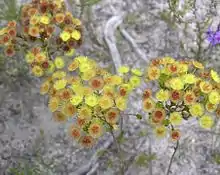 The flowers are lightly scented and are arranged in corymb-like groups on erect stalks from 5–10 mm (0.2–0.4 in) long. The floral cup is top-shaped, about 1.5 mm (0.06 in) long, ribbed, slightly wary and glabrous. The sepals are yellow, turning deep red with age, about 3 mm (0.1 in) long, with 8 to 10 densely hairy lobes. The petals are a similar colour to the sepals, about 3 mm (0.1 in) long and have long, pointed, finger-like projections. The style is 0.5–1 mm (0.02–0.04 in) long, straight and glabrous. Flowering time is from September to October.[1]