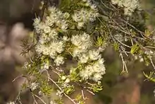 Verticordia verticillata is an openly branched shrub or small tree possessing a lignotuber and which grows to a height of up to 6 m (20 ft) and a width of 2 m (7 ft). The leaves are arranged in whorls of three or four and are linear in shape, semi-circular to triangular in cross-section, 6–30 mm (0.2–1 in) long, 0.5 mm (0.02 in) wide with a pointed end.[1][2][3]
