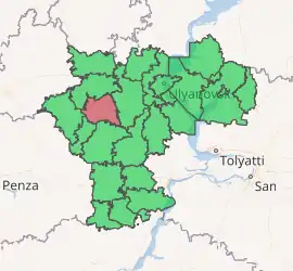 Veshkaymsky District (Russian: Вешка́ймский райо́н) is an administrative[1] and municipal[6] district (raion), one of the twenty-one in Ulyanovsk Oblast, Russia. It is located in the western central part of the oblast. The area of the district is 1,435.5 square kilometers (554.2 sq mi). Its administrative center is the urban locality (a work settlement) of Veshkayma.[1] Population: 19,801 (2010 Census);[3] 23,355 (2002 Census);[8] 25,802 (1989 Census).[9] The population of the administrative center accounts for 33.4% of the district's total population.[3]