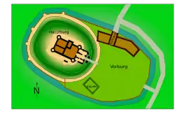The rectangular main building, a keep about 25 metres (82 ft) long and 15 metres (49 ft) wide with three upper stories and a basement, was secured by four round towers attached to its edges, a wall and a moat.[4] One of the keep's towers (Hungerturm) was used as a dungeon to incarcerate abducted people held for ransom.[4] Attached to the keep's eastern front was the entrance building (Vorschloß), about 10 metres (33 ft) long and 12 metres (39 ft) wide.[4] In front of the entrance to the keep, which could be reached by a drawbridge, laid the courtyard (Vorburg), and both the keep and the courtyard were surrounded by an outer wall and another moat.[4]