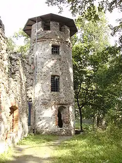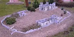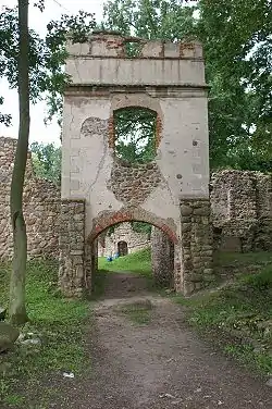 In the west, the outer wall was immediately adjacent to the inner moat and comprised five small bastions.[4] The castle was entered through a gatehouse in the northern outer wall, comprising a guardhouse west of the gateway that led to the courtyard, and the stables in its eastern part, where also a well was located.[4] A second drawbridge,[4] made from copper according to legend, spanned the outer moat in front of the gatehouse.[2] Two other separate buildings stood on the courtyard - a chapel to the south and a kitchen to the east.[4] The castle was finished in 1579.[4]