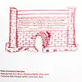 This defensive construction was between four and five meters thick. The two doors of the surrounding wall were built on stone blocks reused from previous buildings such as funerary monuments. Close to the foundation of the Viennoise door, inscriptions can be found on the stones, which attributes them to earlier funerary monuments. Vertically planted wooden stakes served as foundation for the construction. Every side of the wall was formed by a regular setting of rubble-stone. Inside, the blockage was composed of diverse materials, and covered in whitewash mortar. The initial height of the wall was approximately nine meters. The total length of the wall was close to 1200 meters, set up in the shape of an oval. This defensive structure had a ditch that was full of water, which linked it to the Isère (river) to form a protective moat.[3]