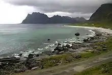 The coastline is dominated by high mountains, such as the 671-metre (2,201 ft) tall Skottinden, and on the west coast also sandy white beaches. Uttakleiv the most romantic beach in Europe, according to the British newspaper The Times, and the neighbouring Hauklandsstranden is ranked by the Norwegian newspaper Dagbladet as the best beach in Norway.