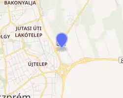 The arena is located in the North Eastern part of Veszprém, just 500 metres away from the roundabout by Külső-Kádártai út, near the main road 82, heading to Győr. Bus line five and thirteen stops 300 metres from the hall at the Kádártai utca terminal, from where the arena is easily and safely approachable through the pedestrian subway.[6] South to the arena is situated a car park, with 750 parking spaces and 16 addition places for buses. Next to that lies a heliport, which is also suitable for rescue helicopters.[7] The entire area of the hall is accessible for the disabled.[5]