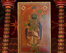 Vettakkoru Makan (Malayalam: വേട്ടക്കൊരുമകന്) is a Hindu deity worshipped in parts of North Kerala and North-Western Tamil Nadu. This deity is alternately referred as Kiratha-Sunu (son of Kirata) in Sanskrit.[1][2] Vettakkorumakan is believed to be the son of Lord Shiva by his consort Parvathi, born when he assumed the form of a Kirata (hunter) to deliver a weapon known as Pashupathasthra to Arjuna. He is mostly and exclusively worshipped in Malabar region of Kerala. The most famous temple of this deity is the Balussery-Kotta Vettakkorumakan temple about 25 km from Calicut. This was once the fort of the Rajas of Kurumbranad. Other prominent temples are at Ramanthali, Nileshwar, Kottakkal, Nilambur, Karaparamba and various places in Kannur district and Kasargod district. He is the family deity of the Rajas of Chirakkal, Nileshwar, Kottakkal, Nilambur Kovilakam, Kalathil Kartha's, Aluva, Amarambalam Kovilakam and Randu Illam Vargam Nambiars. Those families among the nobility of Malabar who have Vettakkorumakan as their family deity are connected in one way or other incidentally to either Balussery Fort or Kurumbranad.Later he moved to Kottanachery temple in Vellur, Payyanur in North Malabar. A special type of firecracker called "Kathina" was his favourite.