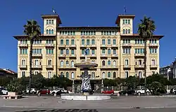 ![]() A view of one of Viareggio's Hotel Royal along the passeggiata ("promenade"), with the "Fountain of the Four Seasons" by Beppe Domenici in front. | |