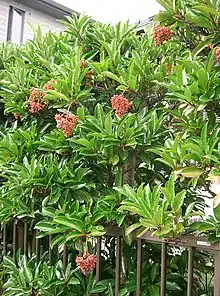 It grows to 9 metres high and has glossy elliptical leaves to 20 cm long. In spring it produces pyramid-shaped clusters of fragrant white flowers, followed by red berries that age to black.[2]