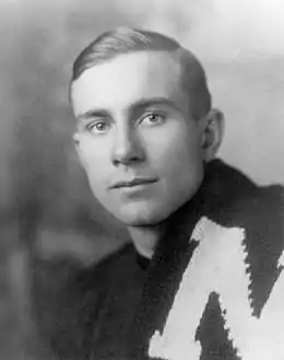 At the University of Nebraska, Halligan played at the left tackle and fullback back positions for the University of Nebraska football team from 1912 to 1914. He was also a member of the Phi Delta Theta fraternity. As a sophomore in 1912, he played at the fullback position and helped lead Nebraska to a 7–1 record.[2] As a junior, Halligan was moved to the left tackle position and was one of the stars of Jumbo Stiehm's 1913 Nebraska Cornhuskers football team that won the Missouri Valley Conference championship and defeated the University of Minnesota to cap an undefeated 8–0 season.[3][4] At the end of the 1913 season, Halligan was chosen as the captain of Nebraska's 1914 team. As a senior, Halligan again played at the left tackle position and led the 1914 Nebraska Cornhuskers football team to its second consecutive undefeated season with a record of 7–0–1.[5][6] In Halligan's three seasons at Nebraska, the Cornhuskers put together a 14-game win streak and compiled a three-year record of 22–1–1.[7] At the conclusion of the 1914 football season, Halligan became Nebraska's first All-American football player.[8] He was selected as a first-team All-American by Frank G. Menke, sporting editor of the International News Service,[9] the Pittsburgh Gazette-Times,[10] and The Michigan Daily,[10] a second-team All-American by Walter Eckersall of the Chicago Tribune[11] and a third-team All-American by Walter Camp for Collier's Weekly.[12] The University of Nebraska yearbook for the Class of 1915 noted Halligan's contributions to the football team: "The premier punter of the West, A master of the forward pass, A tackler equal to the best."[13]