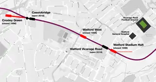 The station fell out of use when British Rail closed the railway line in 1996 and has remained derelict ever since. A new London Underground station, Watford Vicarage Road, was due to open in 2020 on the opposite side of the Vicarage Road bridge as part of the Croxley Rail Link project to extend the Metropolitan line to Watford Junction.[25] However since March 2017 the project has been in doubt due to a significant shortfall in funding from various government entities.[26]