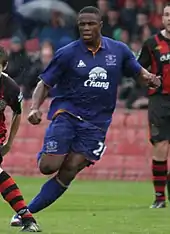 Anichebe made his reserve-team debut for Everton as a 15-year-old and his first-team debut less than two years later on 27 February 2006, as a substitute in the 89th minute of Everton's FA Cup fourth round tie against Chelsea, replacing Simon Davies. He signed his first professional contract with Everton, a two-year deal, in April 2006.[10] On 7 May 2006, he scored his first Premier League goal, against West Bromwich Albion.[11] He was awarded Everton's Reserve Player of the Season for the 2005–06 season.[12]