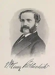 Victor Henry Rothschild was one of seven children born to a Jewish family on April 6, 1835 in Nordstetten, Baden-Württemberg, Germany.[1] His father owned a small retail store.[1] In 1852, he immigrated to the United States settling in Oakland, California.[1] He started as a travelling optical goods salesman using a wagon as a store which soon morphed into a general goods distributor to both individuals and small stores.[1] In 1854, at the invitation of his brother-in-law, he moved to Mount Carroll, Illinois where they opened a retail store in Rothschild's name all the while he kept his distribution business operating.[1] His ventures were successful and his brother Marx emigrated from Germany to join the business.[1] The Panic of 1857 resulted in the failure of their business and the brothers moved first to Macon, Georgia and then to Hawkinsville, Georgia where they opened a small retail store.[1] The advent of the American Civil War required that he shutter his business and he moved to New York City while his brother returned to Germany to care for their ailing father.[1] He used his savings to settle some $38,000 in debt in his name that was incurred by his brother-in-law.[1] Once settled, he was able to start a new business manufacturing négligée shirts then a new trend.[1] His brother returned from Germany and the business - known as Rothschild Brothers - expanded greatly.[1] The company was renamed Rothschild Brothers & Gutman after they took Simeon Gutman as a partner; in 1877, the partnership was dissolved and the business continued operating as V. Henry Rothschild until in 1880, the name changed to V. Henry Rothschild & Co with Isaac Dreyfus as a partner.[1] The company grew to over 7,000 employees with factories in New York and New Jersey.[1]