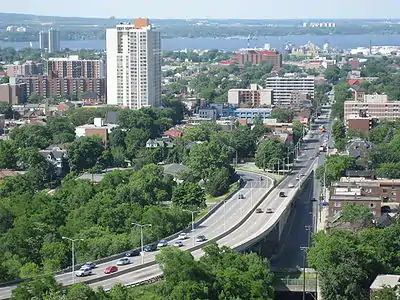 Victoria Avenue is a Lower City arterial road in Hamilton, Ontario, Canada. It starts off as a ramp and part of a Mountain-access road, the Claremont Access, on Hunter Street East in the Stinson neighbourhood. It's also a one-way thoroughfare that flows north through the Landsdale and the city's North End industrial neighbourhood past Burlington Street East where it ends at Pier 11.