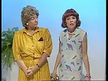Julie Walters was a long term collaborator of Wood's, although unlike Wood and Walters, their previous television series together, only Wood's name remained in the title. This was because in the interim, Wood was getting viewers of it turning up to her solo stand up shows expecting to see a double act.[24] This didn't stop Wood making Walters almost as prominent in this newer series. She played many two handers with Wood as well as other roles such as daytime television host Margery, a mad shoe shop lady, the elderly waitress in the Two Soups sketch, and a transsexual hairdresser. Most famously, she played cleaning lady Mrs. Overall in Acorn Antiques. She later revealed that alongside her starring role in Educating Rita, it's the part she's still recognised the most by the public for.[25]