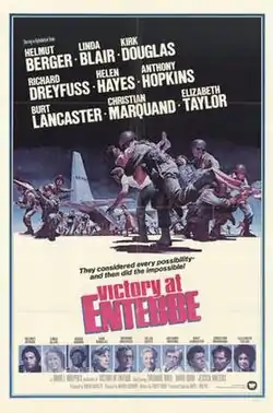 Victory at Entebbe is a 1976 American made-for-television action-drama film for broadcast on ABC, directed by Marvin J. Chomsky. The film starred Helmut Berger, Linda Blair, Anthony Hopkins, Burt Lancaster, Elizabeth Taylor, Richard Dreyfuss, and Kirk Douglas. Julius Harris portrayed Idi Amin, following the fatal heart attack suffered by the actor originally cast in the role, Godfrey Cambridge.[1] [Note 1] The film was theatrically released in Europe.