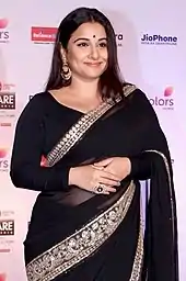 Her starring roles in Heyy Babyy and Kismat Konnection also led to considerable attention in the media for her "questionable wardrobe". Several publications listed her as the "worst dressed actress" and her costume designers attributed her failure to carry off western clothes due to her weight and body structure.[184][185][186] She was later praised in the media for wearing saris at public events; designer Niharika Khan explained, "Vidya's beauty lies in her curves. She's comfortable in her voluptuousness, and therefore in a sari."[187] Vidya has since been identified as defying "an anglicised idea of sexuality" and embody the idea of "raw Indian sexuality".[181]