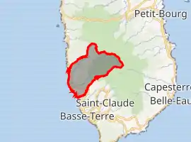 Vieux-Habitants is located in the southwest of Basse-Terre island, 87 kilometres southwest of Pointe à Pitre.[2] It is bordered by the commune of Baillif to the south and Bouillante to the north. The commune also contains the village of Marigot to the north, between Vieux-Habitants village and Bouilliante. The Grand-Rivières river and forests forms a major part of the local scenery, flowing through the Domaniale forest of Guadeloupe National Park into the sea. Natural landmarks include the Plage de Rocroy beach, the Beaugendre Valley of the Grand-Rivières and L'Etang.[5] There are numerous fresh water pools in the commune.[2]