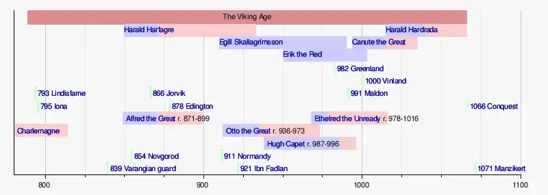 The Viking Age (793–1066 AD) was the period during the Middle Ages when Norsemen known as Vikings undertook large-scale raiding, colonizing, conquest, and trading throughout Europe and reached North America.[1][2][3][4][5][6] It followed the Migration Period and the Germanic Iron Age.[7] The Viking Age applies not only to their homeland of Scandinavia but also to any place significantly settled by Scandinavians during the period.[3] The Scandinavians of the Viking Age are often referred to as Vikings as well as Norsemen, although few of them were Vikings in the technical sense.[8]