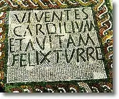 West of the "peristylum", is the "ostium", the principal entrance, with mosaic pavement, forming various decorative, geometric and figurative panels. On one of these is the inscription: "VIVENTES / CARDILIUM / ETAVITAM / FELIXTURRE", while on another is a figure of a Roman couple, circled by craters, a sickle, birds, diametrically opposed 2x2 posts and with flowers in the corners.[1][2] The inscription of the Roman property owners has had differencing interpretations, that included: "Felix of Turre created the mosaics in homage to Cardílio and Avita";[4] "Felix created the picture of Cardílio and Avita, in life, in the locality called Turris";[5] "Torre was happy while Cardílio and Avita lived";[6] "Cardílio and Avita lived here in the happy tower"[1][2][7] The objects in the property-owner's panel, the sickle and the craters, may have represented the cultivation of wheat and vineyard.[1][8]