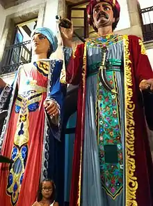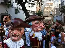 Tradition maintains that Vila Nova (the new town) was founded by people fleeing the abuses of the feudal lord of the castle la Geltrú, particularly his exercise of the Droit du seigneur or jus primae noctis but there is no evidence that this is the case. Other traditions recount conflicts with invading Moors, the coming of the railroad, the inaccessible tunnels beneath the city and stories of a youth confounded by the reflection of the full moon in the water from which Vilanovins receive the nickname llunatics (lunatics), in reference to a supposed mercurial quality of unpredictable emotions.[21][22] Rather than a static tradition, folklore and festa in Vilanova are often used as a public way to respond to current events from immigration to national politics or to defy fears of new epidemics. In an annual children's Christmas play, the troubling ethnic caricature of the Moorish pirate, Moro Manani was replaced by the traditional Catalan figure the Caganer[23] and the avian flu scare was satirized in 2006 by the carnaval figure Moixó Foguer.[24]