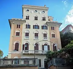 In the 19th century, the villa was enriched and elevated, with the addition of a fourth story, and was known as "Villa Acquarone" or "Palazzo Acquarone",[2] still surrounded by a large park, part of which was landscaped and part used for dairy farming. The milk produced was sold in the historical "vaccheria" (dairy shop) located near the uphill station of the Sant'Anna funicular in via Agostino Bertani, an important contribution to the life of the neighborhood as the area surrounding Genoa was not suitable for dairy farming and milk had to be imported.[3]