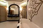 The villa's elliptical staircase is made of brick embellished with fake marble decorations. The staircase starts on the ground floor, with two identical flights to the principal, or noble, floor above. The lighting is enhanced by Swarovski crystals. A modern elevator has been installed in the left wing of the palace, running from the ground floor to the top floor.