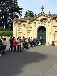 At the northern side of the square the monumental entrance screen is located, also designed by Piranesi under commission from Cardinal Carlo Rezzonico, nephew of Pope Clement XIII. The Villa is arguably best known for a small keyhole (Il Buco Della Serratura) in the arch-headed central portone, through which the copper-green dome of Saint Peter's Basilica, can be viewed at the end of a garden allée framed in clipped cypresses.[5]
