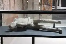 The bodies of two women and a child were found in lower pumice eruption layers of the Villa,[3] indicating they were caught in the early stages. They were on the upper floor of the farm section and plaster casts were made of them as in other areas of Pompeii and Herculaneum. Six bodies (one girl near the entrance, one woman, four in the cryptoporticus) were found in the later higher pyroclastic eruption layers indicating they had survived the first part of the catastrophe.