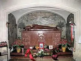 He died from his injuries not long after in the afternoon of 2 April 1945. István Sándor witnessed a stretcher on 3 April being carried from the hospital and saw the bishop's remains as it was being transported. The funeral was put on hold due to conflict in the area but was carried out within a week of his death.[2] His remains were buried in a Carmelite church; his confessor was the Carmelite priest Erno Szeghy who had served as such since 1943 or 1944. His remains were later relocated to the diocesan cathedral.[3] Pope John Paul II visited his tomb in 1996.[2]
