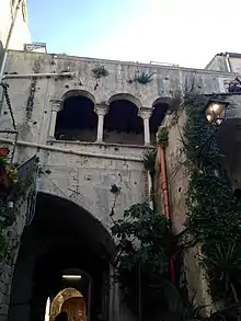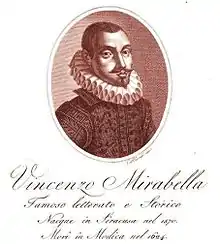 Vincenzo Mirabella, son of Michele Mirabella and Giovanna Alagona,[1] was born into a patrician family of French origin which had moved to Sicily in the early fourteenth century. As a young man he dedicated himself to the study of Greek, Latin and Italian literature as well as mathematics, music, history and poetry. He played an active part in civic life, holding office as magister nundinarum (Master of the Assizes) in 1593, Treasurer of the University in 1613-14 and Jurat, the highest office in the city, in 1616-17.[2] He married Lucrezia Platamone, daughter of Antonio and Giovanna Zumbo, who brought him a substantial dowry and further connections to the leading families of Syracuse. He does not appear to have had any children with her.[1] He lived in a house in Syracuse in front of the Church of St. Thomas in the Pantheon, in a street which bears his name today.