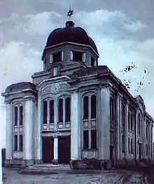 The Second Vinkovci Synagogue was built under the architect Frank Funtak in the Aleksandar street (today the Zvonimir street 18–20). The total cost of construction was 4,5 million krones. Funtak turned to classicism when choosing styles for the Vinkovci Synagogue. Although this style dominated, the building also had elements of the 19th-century synagogue architecture and of art deco. The synagogue dome was built in Mudéjar style, while double windows and the trefoil upper row of windows were built in rundbogenstil. Vinkovci Synagogue had a longitudinal construction with a rectangular shape. Funtak took the dome style from the Vukovar Synagogue. In addition to the dome, a tripartite front was a traditional element of the synagogue architecture from the 20th century. The central part of the facade was slightly withdrawn in relation to the side. The sides of the synagogue were visually highlighted with an art deco set of gables above the cornice of the building.[1][2]