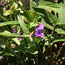 Viola betonicifolia, commonly known as the arrowhead violet, showy violet or mountain violet, is a small perennial of the genus Viola, which contains pansies and violets. It occurs from India and Pakistan in southern Asia throughout eastern Australia and Tasmania. It grows in shaded habitat in forests.