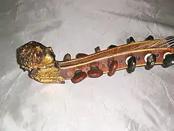 The viola d'amore shares many features of the viol family. It looks like a thinner treble viol without frets and sometimes with sympathetic strings added.[2] The six-string viola d'amore and the treble viol also have approximately the same ambitus or range of playable notes. Like all viols, it has a flat back. An intricately carved head at the top of the peg box is common on both viols and viola d'amore, although some viols lack one. Unlike the carved heads on viols, the viola d'amore's head occurs most often as Cupid blindfolded to represent the blindness of love. Its sound-holes are commonly in the shape of a flaming sword known as "The Flaming Sword of Islam" (suggesting the instrument's development was influenced by the Islamic World). This was one of the three usual sound hole shapes for viols as well.[3] It is unfretted, and played much like a violin, being held horizontally under the chin. It is about the same size as the modern viola.