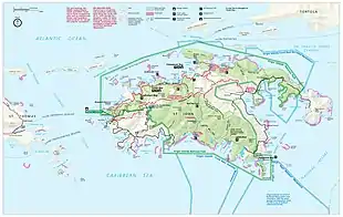 In 2006, The Trust for Public Land purchased the 415-acre (167.9 ha) Estate Maho Bay for preservation.[7] The property includes beaches, undisturbed forest as well as historic Danish colonial and Taíno Indian artifacts.[7] The trust intends to sell the property to the National Park Service as federal funds become available.[8] In 2011, the trust donated 18 acres at Mamey's Peak to the National Park Service.[9] In 2012, the National Park Service purchased 58 acres from the trust for $2.25 million, using money from the federal Land and Water Conservation Fund.[8][10] In 2013, an additional 72 acres of the Estate Maho Bay property was sold to the National Park Service for $2.5 million, the largest addition to the park.[11]