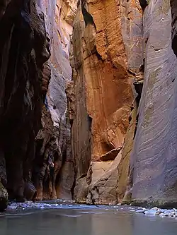The Narrows is the narrowest section of Zion Canyon in Zion National Park, Utah, United States. Situated on the North Fork of the Virgin River and upstream of the main canyon, The Narrows is one of the premier hikes in the park and on the Colorado Plateau. The Narrows refers to both the 3.6-mile (5.8 km) bottom-up hike from the Temple of Sinawava to Big Springs, as well as the 16-mile (26 km) top-down hike from Chamberlain's Ranch back to the Temple of Sinawava.[1]