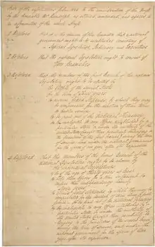While waiting for the convention to formally begin, Madison sketched out the Virginia Plan in consultation with members of the Virginia and Pennsylvania delegations, which shared his vision of a strong national government.[8] While Madison is given chief credit for producing the plan, it was Edmund Randolph, Virginia's governor at the time, who officially put it before the convention on May 29, 1787.[9] In his introduction, Randolph highlighted the problems facing the Confederation. Referring to Shays' Rebellion in Massachusetts, he warned of "anarchy from the laxity of government".[10] The solution to these problems, he asserted, must be based on "the republican principle".[11]