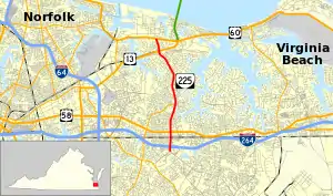 State Route 225 (SR 225) is a primary state highway in the U.S. state of Virginia. Known as Independence Boulevard, the state highway runs 5.40 miles (8.69 km) from South Boulevard north to U.S. Route 60 (US 60) within the independent city of Virginia Beach. SR 225 connects Interstate 264 (I-264) with US 58 in the Pembroke Manor area of the city and with US 13 near Naval Amphibious Base Little Creek and the Chesapeake Bay Bridge-Tunnel. The unnumbered portion of Independence Boulevard to the south connects those areas with the Princess Anne section of the city.