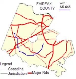 A map of Fairfax County shows that SR 645 is somewhat circuitous: Wall Road is east–west, Lees Corner Road, Stringfellow Road, and the northern part of Clifton Road are north–south, the rest of Clifton Road is mostly east–west, and Burke Lake Road is northeast-southwest.