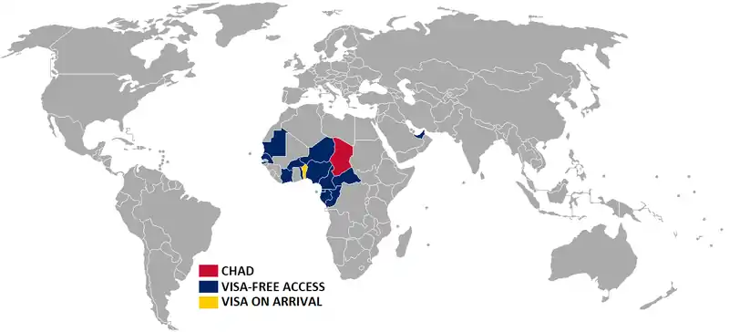 Citizens of the following 15 countries can visit Chad without a visa for up to 90 days:[1]