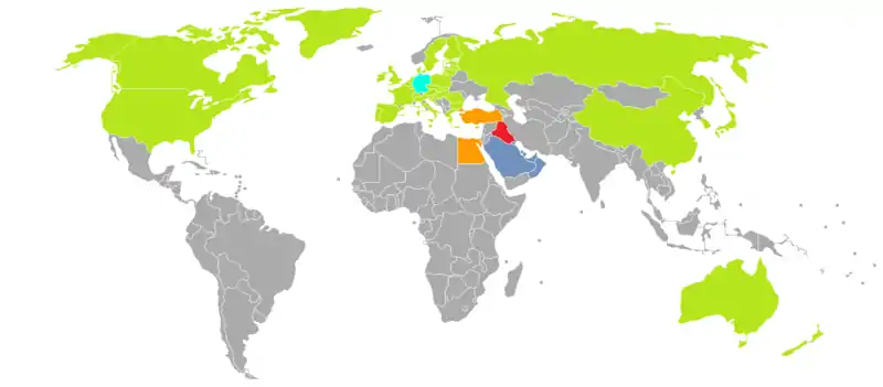 In accordance with Iraqi law, citizens of most countries require a visa to visit Iraq.[1] However, visitors from certain countries are given a visa on arrival in select airports and certain countries are banned from entering Iraq.[2]