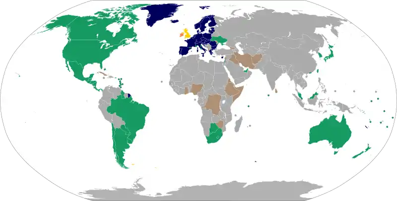 In 1962, Ireland changed the definition of alien and now included those countries named above, with the exception of those born in Great Britain or Northern Ireland.[4] The 1962 Aliens Amendment Order exempted citizens of Austria, Belgium, Denmark, Finland, France, West Germany, Greece, Iceland, Italy, Liechtenstein, Luxembourg, Monaco, the Netherlands, Norway, Spain, Sweden, Switzerland, Portugal, Tunisia, Turkey and the United States from visas for three months. It also gave special provisions to citizens of the British Commonwealth,[n 1] whereby they are exempted by the Aliens Order of 1946, although they may be refused leave to land unless they comply with certain conditions. A 1966 amendment gives rights of admission to those states of the British Commonwealth, which is later revoked in 1972. In 1972, aliens were required to seek work permits from the Minister for Labour to work in the state. In 1975, Ireland published its first list of visa-exempt nationalities and also removed the special provisions from Commonwealth citizens under Irish law.[5] 1999 was the first development of a comprehensive list of countries which required visas.[6]