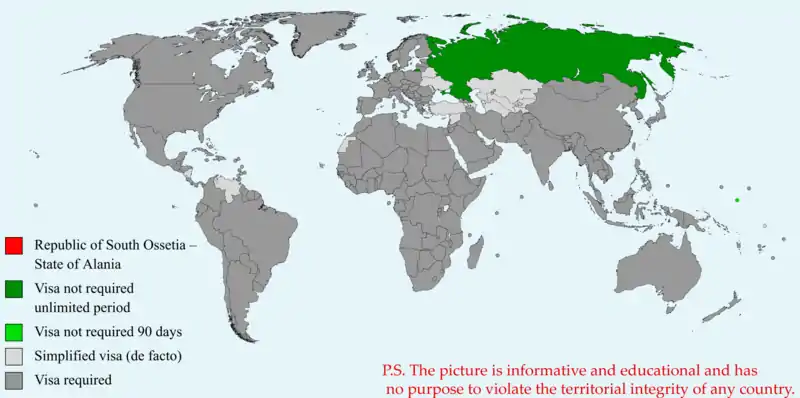 South Ossetia does not issue visas. However, visitors are required to receive approval from the South Ossetian government in advance of their visit unless they are citizens of an exempt country. Because South Ossetia is only accessible through Russia, visitors are also required to hold a valid Russian visa that permits them to return to Russia unless they are Russian citizens or citizens of countries that are exempt from Russian visa requirements.[1]