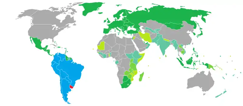 Uruguay is a full member of Mercosur. As such, its citizens enjoy unlimited access to any of the other full members (Argentina, Brazil and Paraguay) and associated members (Bolivia, Chile, Colombia, Ecuador and Peru) with the right to residence and work, with no requirement other than nationality. Citizens of these nine countries (including Uruguay) may apply for the grant of "temporary residence" for up to two years in another country of the bloc.[2] Then, they may apply for "permanent residence" just before the term of their "temporary residence" expires.[3][4]