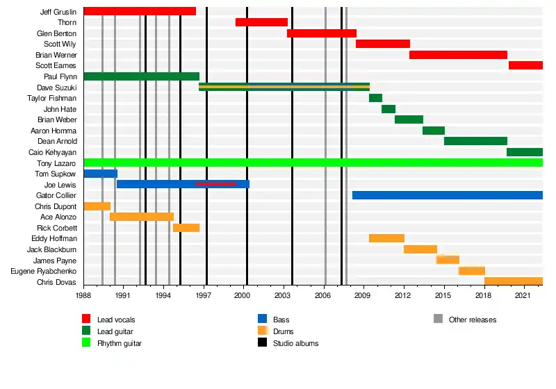 Three of the band's former vocalists died between 2017 and 2018. On July 4, 2017, Chris Ross was fatally shot by his brother-in-law, James Ball.[4] On November 2, 2017, Scott Wiley was reported dead with no cause of death revealed,[5] followed by Jake Raymond on June 25, 2018.[6]