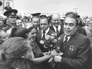 Vladimir followed in the footsteps of his father. In 1969 he graduated from the KGB school in Saint Petersburg and received advanced training in shooting, wrestling, running and swimming. After graduation, for two years he supported routine surveillance and transportation security of Soviet leaders. In December 1971 he joined the 9th Department of KGB that was responsible for protection of Leonid Brezhnev.[2][3] He remained a bodyguard for Brezhnev until Brezhnev's death in 1982, saving him from several potentially fatal driving and swimming accidents. Brezhnev personally knew Bogomolov and protected him from being discharged for minor disciplinary offenses.[4] Brezhnev traveled a lot, so that in 1974 alone, his security team spent 276 days away from Moscow.[5]